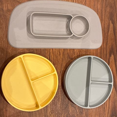 Børnekop og skeer i silikone fra Mushie (str. 11,5 og 16 cm)