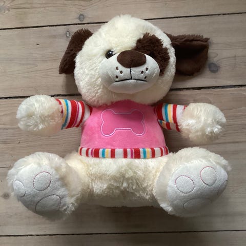 Denne teddy bamse er blød og hyggelig, med en lys brun farve og et venligt ansigt. Bamsen har en hvid sløjfe rundt om halsen og røde hjerteformede detaljer under fødderne. Den måler 36x20 cm, hvilket gør den til en perfekt krammeven og dekorativ del af børneværelset.