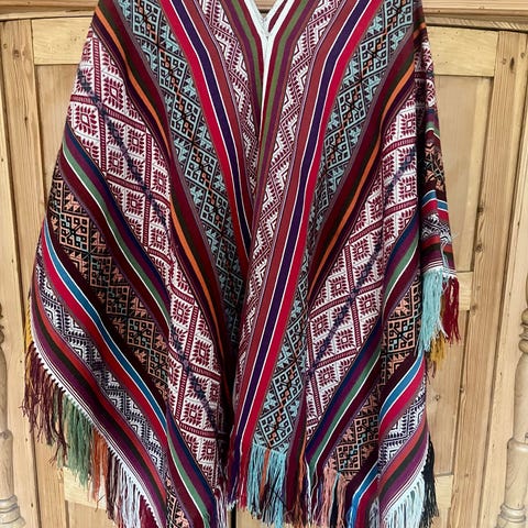 Kunsthåndværk og meget smukt vævet poncho er fra Peru og håndlavet. Den er meget flot udført med flere tekniske svære detaljer. I uld alpaca materiale. Onesize kan bruges af begge køn. Brug den når man har brug for en trøje og sidder udenfor, eller er du vinterbader så tag den over når du kommer op, eller hav den hængende som pynt.