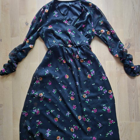 Vero Moda hverdagskjole i størrelse M. Kjolen er hvid med et mønster af sorte og brune blomster. Fremstillet i polyester og designet til kvinder.