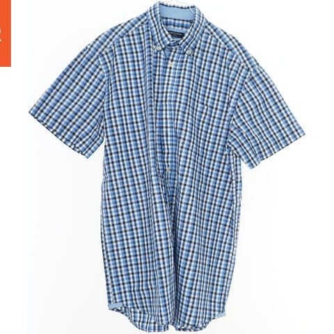 Langærmet skjorte med knoplukning og krave. Skjorten er blå med hvide striber og har to brystlommer med lommeklap. Der er tekstbroderi på den ene brystside.