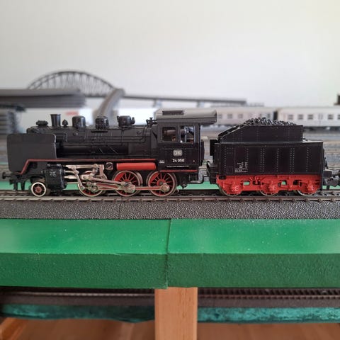 Modeltog damplokomotiv i metal med grå overflade og røde hjul. Lokomotivet har detaljer som skorsten, kabine og drivmekanisme. Velegnet til modeljernbaneopsætninger eller samlinger.