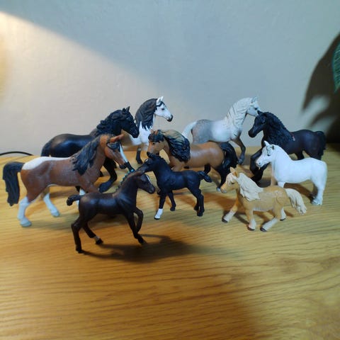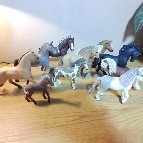10 Figurer.. Alle er Schleich og i standen som ses på billedet. Figurerne sælges kun sammen i den pakke der er vist, Ingen løssalg. Sender med fast pris uanset vægt og antal af lots med DAO til 47kr.. Inkluderer: Heste, Føl, Pony