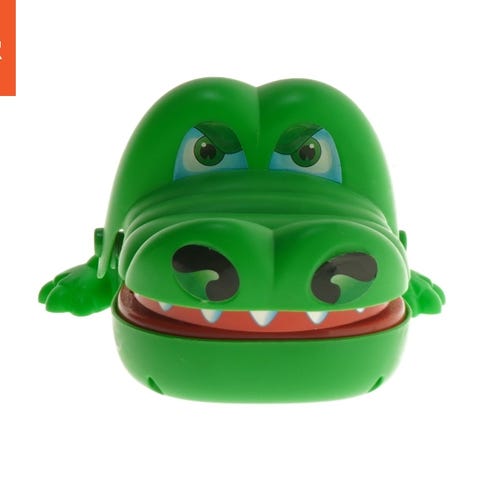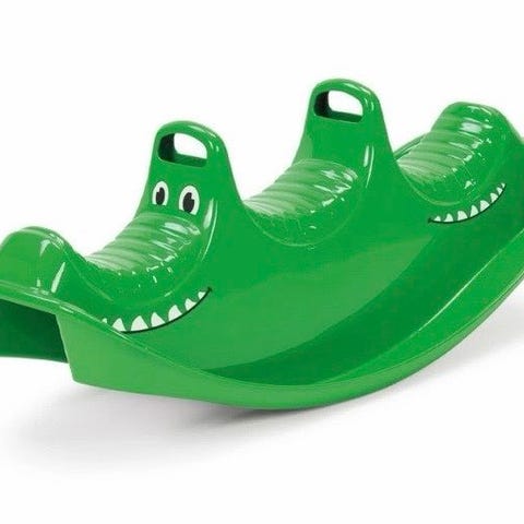 tags: krokodille, plastik, kaste, gribe, grøn, udendørslegetøj, legetøj, børn, haveleg, ferie, sommer, sol, leg, strand, sommerhus