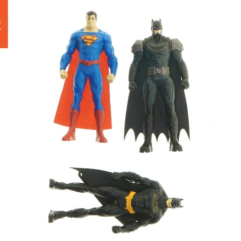 Denne actionfigur forestiller Superman, en populær superhelt fra tegneserierne. Figuren er cirka 30 cm høj og har de karakteristiske røde og blå farver, som Superman er kendt for. Den har en rød kappe med et gul Superman-symbol. Figurerne er lavet af plast og har en robust konstruktion, egnet til leg eller samling.