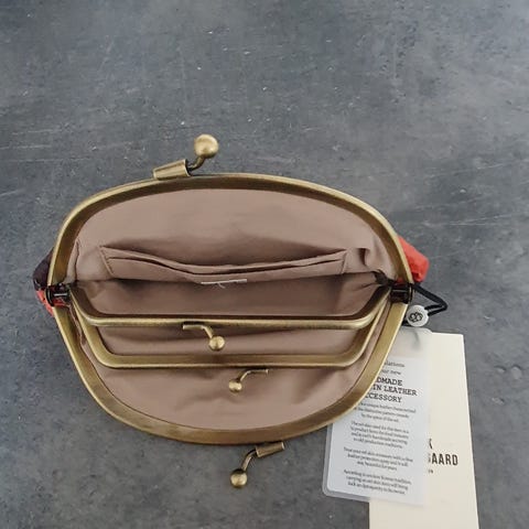Sort krokodillemønstret pung med metal lynlås. Pungen har slots til kort, og plads til sedler eller mønter. Den er lavet af Beck Söndergaard, som omtales indvendigt i pungen.