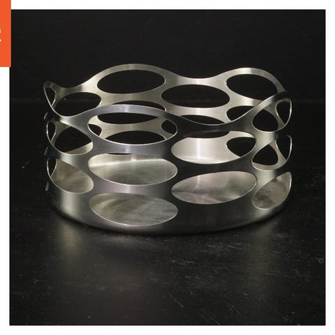 Skål lavet af skinnende metal, med en bølget kant og glat inderside. Skålen har en diameter på 21 cm og en højde på 3 cm. Skålen er ideel til servering af frugt eller snacks, og dens reflekterende overflade kan tilføje et elegant touch til ethvert bordopdækning.