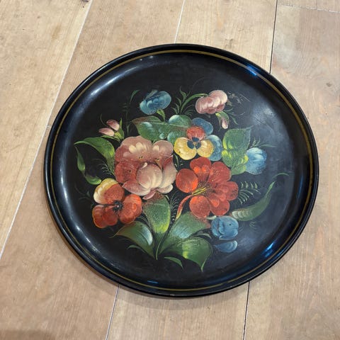 Dette er en dekorativ tallerken med et smukt håndmalet blomstermotiv i midten. Tallerkenen har en buet kant og en sort baggrund med enkelte guld detaljer rundt om kanten. Den måler 19,5 x 16,5 cm i størrelse. Bagsiden af tallerkenen ser ud til at have en producentmærke eller stempel samt en etiket.