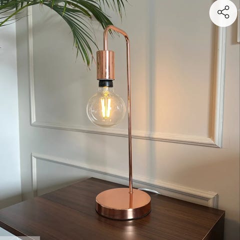 Dette er en rund lampe med et kobberfarvet udseende og bladmønster på ydersiden. Lampen har en diameter på 20 cm og en højde på 9 cm. Indeni ses elektriske komponenter, som indikerer, at der er en lyskilde inde i lampen. Den kan bruges som en bordlampe eller til dekoration.