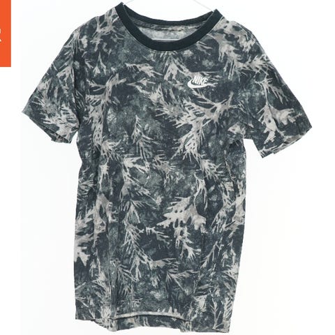 T-shirten er grå og har korte ærmer. På forsiden er der et stort, hvidt Nike-logo trykt centralt. Bagsiden er ensfarvet grå uden tryk.