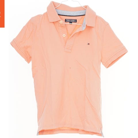 En orange polo t-shirt med korte ærmer. Den har en krave med knapper og et lille broderet Tommy Hilfiger logo på venstre bryst.