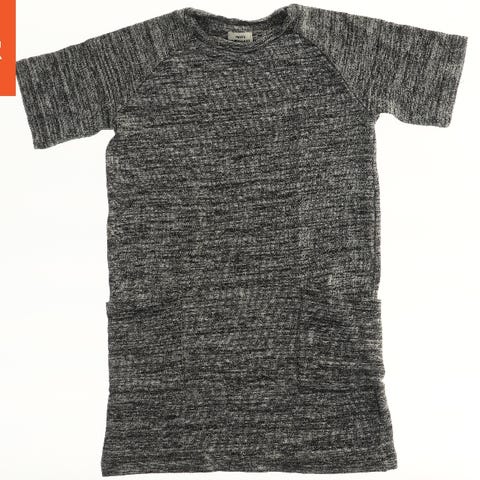 En børnekjole i grå/blå farve med lange ærmer.