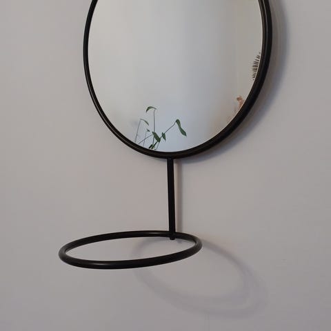 Dette er et rundt spejl med en diameter på 16,5 cm, monteret i et robust metalstativ. Spejlet er designet til at stå oprejst, hvilket gør det ideelt til anvendelse på borde eller kommoder. Det kompakte design gør det nemt at placere og flytte rundt i hjemmet. Spejlets kant og stativ er lavet af metal, hvilket giver det et moderne og minimalistisk udseende.