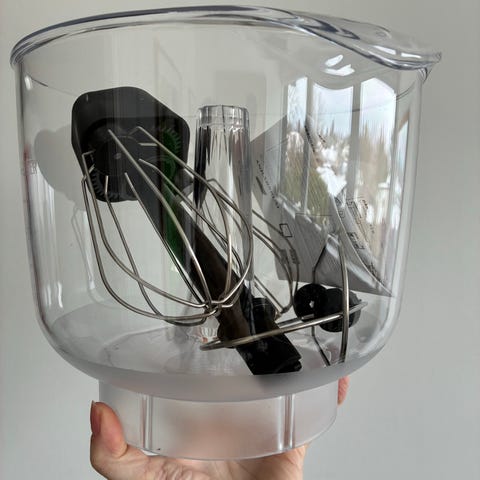 Ankarsrum tilbehørssæt til køkkenmaskine bestående af forskellige skåle, piskeris, citruspresser og låg. Der er blender og røreskål med forskellige typer piskeris.