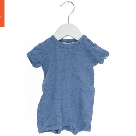Dette er en kortærmet bodystocking i ribstrik, som er lyseblå. Den har trykknapper på skulderen og forneden for nem påklædning og skiftning. På bagsiden er der et lille mærke med farvestriber.