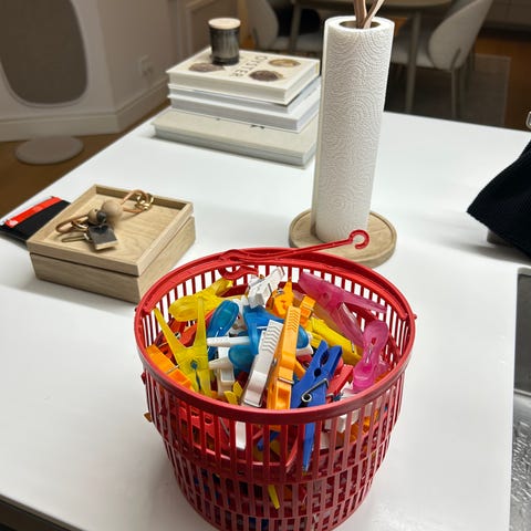 Tags: tøjklemmer, kurv, plastikkurv, tørrestativ