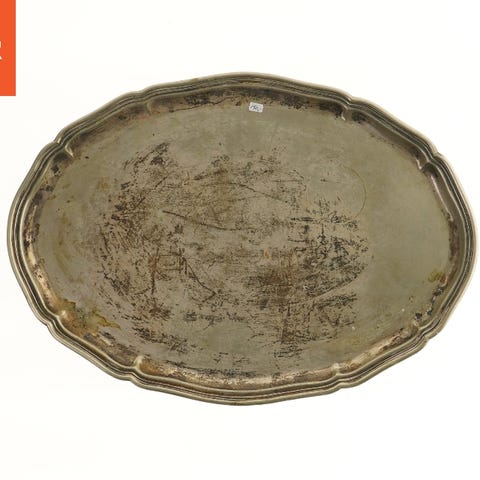 Dette er et metalfad med en diameter på 15 cm. Fadet har en unik spiralformet base, der skaber et dekorativt udseende. Toppen af fadet har et rustikt udseende med forskellige farvenuancer spredt henover overfladen, der tilføjer en vis karakter til objektet. Bunden viser tegn på patina, hvilket kan tilføje til det antikke look.