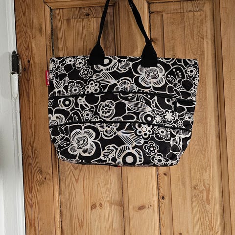 Dette er en sort indkøbstaske med farverige prikker. Tasken er ny og stadig i plastindpakning. Den har en stærk og holdbar tekstilstruktur, perfekt til dagligvarer eller som en moderigtig accessory. Tasken er af mærket Reisenthel og er en del af deres cityshopper-serie. Den robuste taske kommer med metaløjer til håndtagene, hvilket gør det nemt at bære.