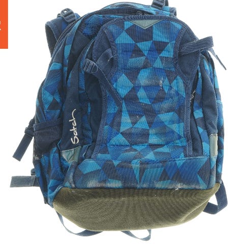 Rygsæk med et geometrisk og farverigt mønster, der inkluderer nuancer af lyserød, blå, grøn og sort. Den har flere rum med lynlåse og justerbare skulderstropper. Materialet er robust og størrelsen er 45x38 cm.