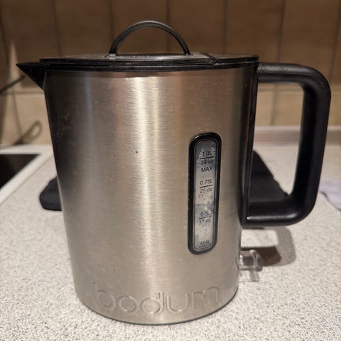 En elektrisk kedel fra Bodum med en kapacitet vist på siden af 1 liter (34 oz). Kedlen er hvid med røde knapper på toppen og har en europæisk stikprop. Den er 22 cm høj og har en tydelig viser til vandniveau. Ledningen kan nemt vikles rundt om bunden af kedlen for opbevaring.