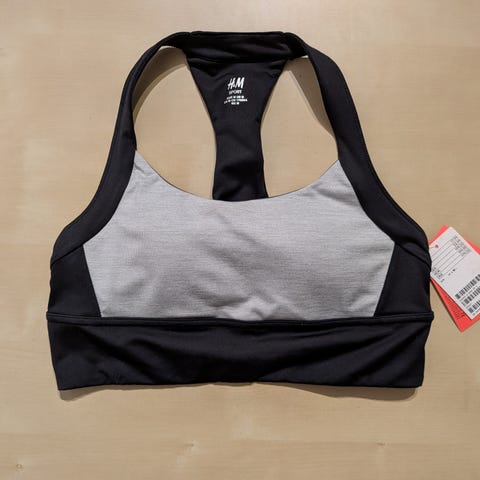 Sort sports-bh fra H&M med racerback-design og elastisk kant. Størrelsen er 164, hvilket typisk passer til større børn eller unge. Ideel til sportsaktiviteter for komfort og støtte.