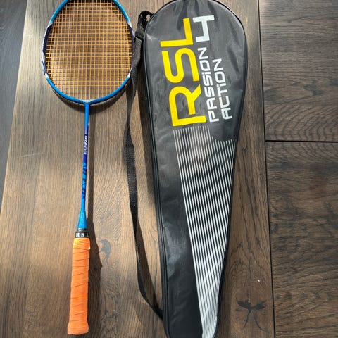Badmintonketcher med en beskyttende taske. Tasken har 'RSL Passion 4 Action' trykt i rød og hvid tekst og en skulderrem til nem transport. Ketcheren har et slankt design med RSL brand navnet på skaftet. Den har en gul strenget overflade og sort håndtag med grip. Velegnet til badmintonspillere på alle niveauer. Tags: sportsudstyr, badminton, ketcher, taske