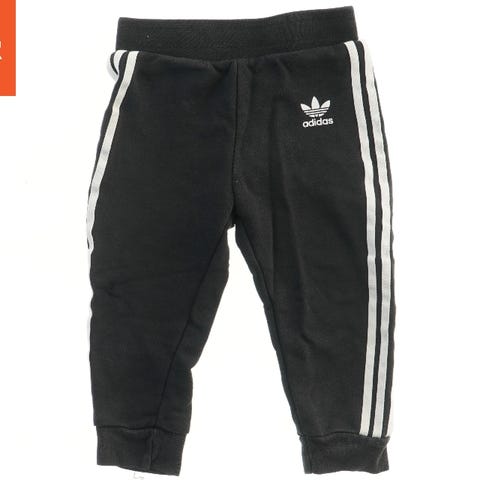 Grå træningsbukser med elastik i taljen og manchetter ved anklerne. Bukserne har to blå striber langs siderne og et Adidas-logo på forsiden.