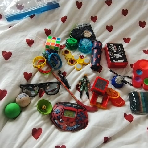 Div. Til børneposer, til jul, børnefødselsdage etc. har haft brugt det til juleposer til børn over 3 år. Farver, blyanter , malebøger (der er taget lidt sider til juleposerne). Der er ca 45 pk farvekridt tilbage i æsken og flere i godteposerne