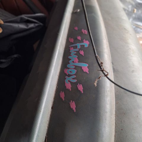 Gratis. Grå tagboks med tekst bortgives. Boxen er ca. 175 cm lang og 80 cm bred.