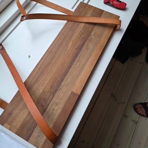 Hylde af træ med læderstroppe fra by Ravn. Fra røgfrit hjem
