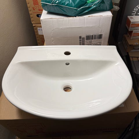 Hvid porcelæn håndvask med overløb og armatur. Vaskens mål, se fotos. Velegnet til badeværelse eller gæstetoilet.