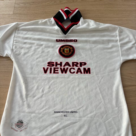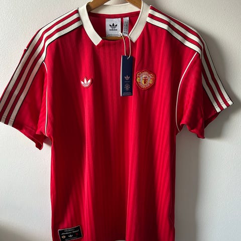 Umbro Manchester United fodboldtrøje i størrelse L til herre. Trøjen er rød med hvide og sorte detaljer, herunder navn og nummer på ryggen. Materialet er egnet til sport, specifikt fodbold.