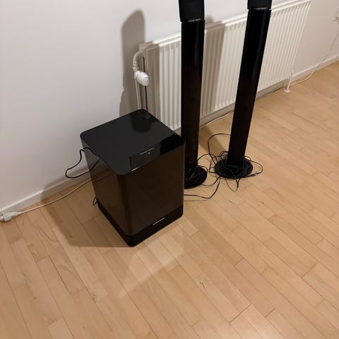 Medfølger kabler (lidt slidte lydkabler, men ok. Samt Trådløs enhed) strømkabel 100% ok