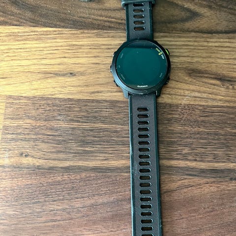 Garmin Forerunner 645 GPS-løbeur med mulighed for offline musik og, via trediepartsapp, kortnavigation. Billederne snyder lidt, men det er den sorte udgave, hvor også bezelen er sort. Inkluderer opladerkabel med USB-tilslutning. Fin stand, batteriet er stadig friskt.