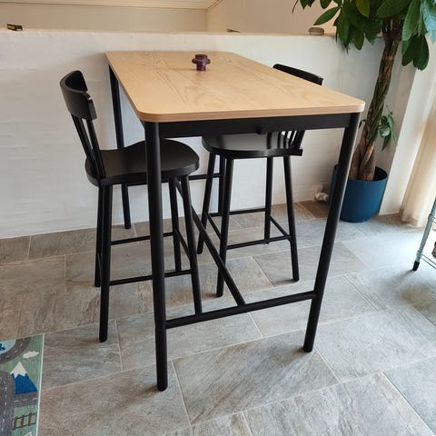 Højbord med 4 barstole. Bord i sort træ fra Ikea med mål 70 b x 130 lang x 1,04 høj. Med brugsspor og stolene med enkelte pletter.