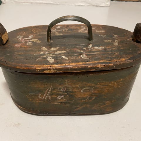 Harmonikasyskrin i to etage. Ruminddeling i det ene øvre rum. I fin vintagestand og åbner og lukker fint. Alle skruer sidder i og bærehanken sidder fast. Beslag er lidt anløbne og det er afslag på det ene hjørne. Små huller i låget som måske er efter borebiller (der er ingen nu😬) Se fotos. 32.5*18.5 H12.5 cm. Du kan loppesjoppe det for 245 kr.