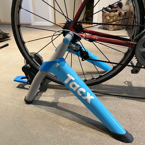 Tacx cykeltræner med elektrisk modstand, designet til indendørs cykeltræning. Passer til forskellige cykelstørrelser og giver mulighed for justerbar træningsintensitet.
