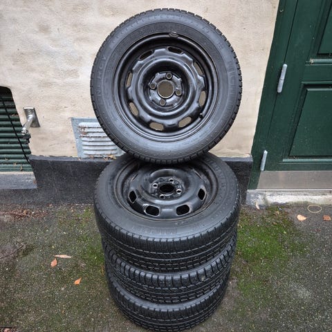 Stålfælge med vinterdæk. 2 dæk skal udskiftes, 2 kan køre en sæson mere.