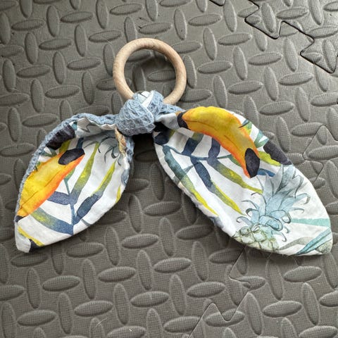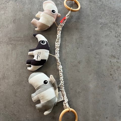 Done by Deer bidering med spejl til børn. Den har en blød, grå bagside og en blå front med spejl i midten. Indeholder stribede stofdetaljer som fødder. Egnet til små børn til sanse- og motorisk stimulering.