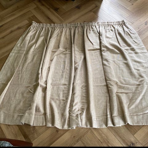 2 stk meget flotte gardiner i lys beige med tynde brune og hvide striber. Har været hængt op i 3 mdr. B 153 cm og H 145 cm . Der medfølger gardin stang i B 140 cm og persienne i B 120. Der medfølger ophæng med. De er syet af Gardin firma. Pris kr 1500.