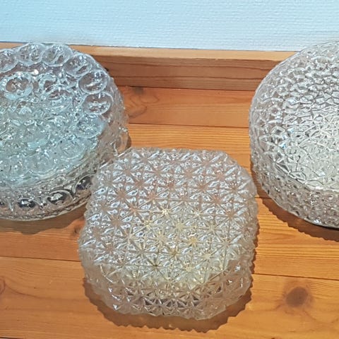 Et sæt Flotte Vintage glasplafond loftslamper, SLG A/S, Danmark, 1970’erne/80’erne, lys røg mønstret glas, med porcelæns fatning og til stor el pære Mål H. 10 cm D. 20 cm