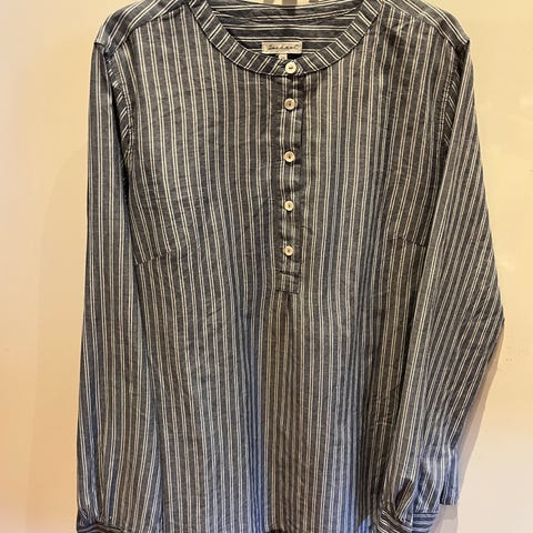 Lækker velholdt lang skjorte/ kjole i råhvide og mintgrønne striber. Lommer i sidesømmen og knap+stropper til oprul af ærmer. Længde 105 cm, Overvidde 126 cm, ærmelængde 28 cm. Lavet i økologisk bomuld.