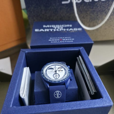 This chronograph features a navy Bioceramic case, crown, and pushers, paired with a matching navy rubber strap Introducerer oktobers Mission to Earthphase – Moonshine Gold, den tredje kronograf i serien.