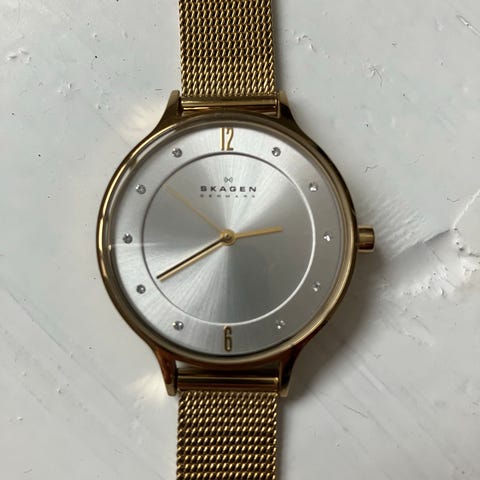 Skagen SKW2156 dameur med rund urskive og mesh-lænke i guld. Uret har en sølvfarvet urskive med minimalistiske timeindikatorer og visere.