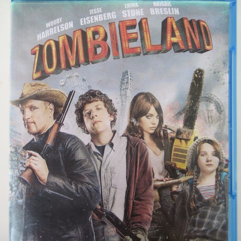 Zombieland Blu-ray film med skuespillere Jesse Eisenberg, Woody Harrelson, Emma Stone og Abigail Breslin. Filmen er i dansk udgave og anbefalet fra 15 år.