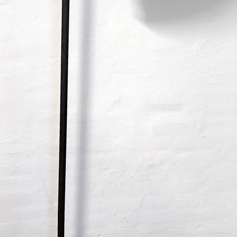 Sort gulvlampe i metal med justerbar arm og rund lampeskærm. Lampen har et industrielt design og er egnet til brug i stuer, kontorer eller lignende indendørs miljøer.