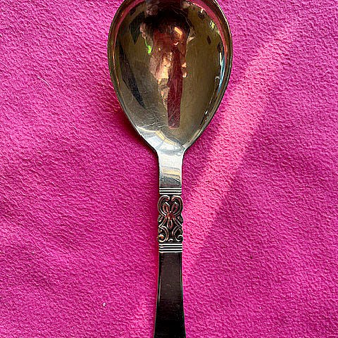 Robust serveringsske med fornem bladdekoration øverst på skaftet og en mindre matchende udsmykning før skeblad.