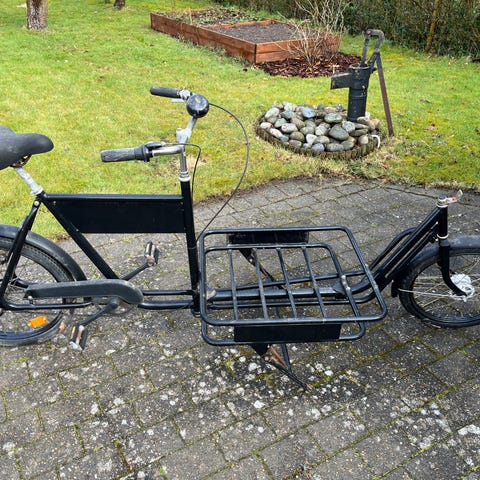 Ca 8 år gammel, brugt meget sparsomt. 3 gear, rulle forbremse, centerfod. Opgraderet med sidestøttefod og styrekugler for bedre styring. Ellers helt standard.