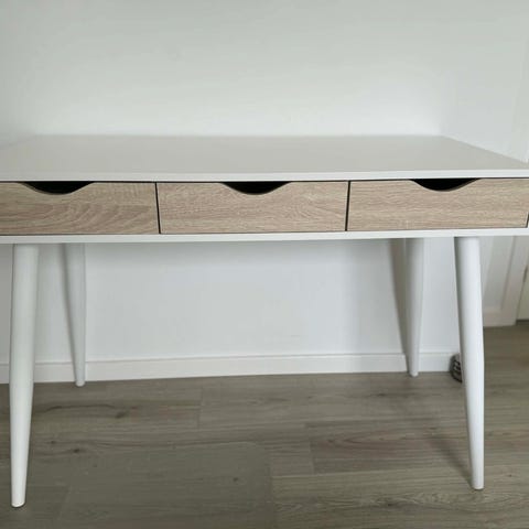 Brugt skrivebord. Model PLOVSVAD fra Jysk. Har lidt brugsspor (fugt) på bordpladen - se billeder. Hvid med lys egefarve. Nypris 1.399kr.