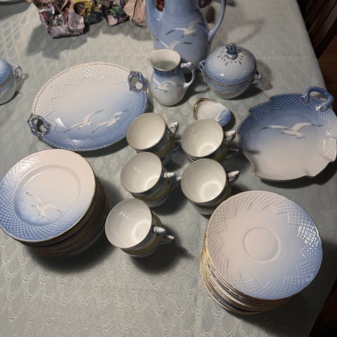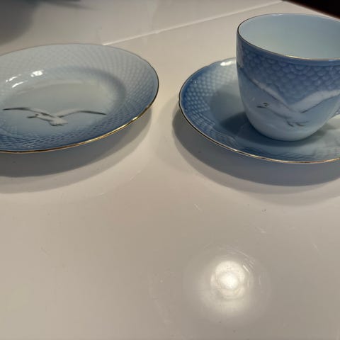 21 sæt kaffekop/underkop/kagetallerken i mågestel med guldkant.